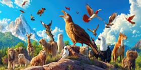 Wildlife Panorama: Majestic Mountain Landscape with Diverse Animals. Scenic photo featuring birds, cats, and a lion. Perfect for nature, wildlife, and travel projects.