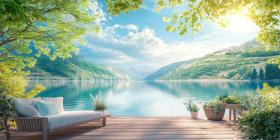 Scenic Lake with Boat and Wooden Dock. Tranquil landscape with crystal-clear water and lush greenery. Perfect for travel, nature, and vacation themes.