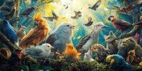 Wildlife Panorama: Majestic Mountain Landscape with Diverse Animals. Scenic photo featuring birds, cats, and a lion. Perfect for nature, wildlife, and travel projects.