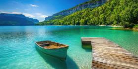Scenic Lake with Boat and Wooden Dock. Tranquil landscape with crystal-clear water and lush greenery. Perfect for travel, nature, and vacation themes.