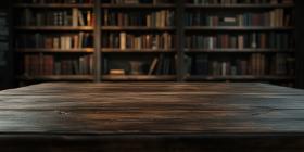 Vintage Library Reading Table. Wooden tabletop with a blurred bookshelf background. Perfect for education, literature, and nostalgic themes.