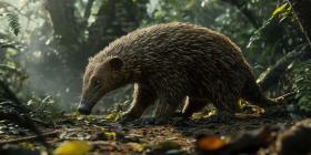 Golden Mole in the Rainforest. Close-up portrait of a small, furry mammal with a pointed snout. Perfect for nature, wildlife, and exotic animal themes.