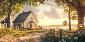 Modern Farmhouse Exterior at Dusk. Two-story home with a welcoming porch and landscaped yard. Perfect for real estate, architecture, and home design themes.