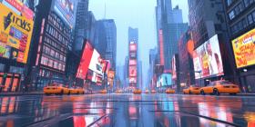 Rainy Times Square at Dawn. Empty city streets with iconic billboards and yellow cabs. Perfect for urban, cinematic, and atmospheric themes.
