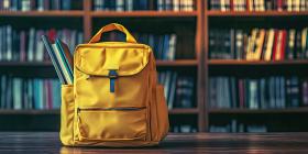 Back to School Preparation. Yellow backpack with books in front of a library bookshelf. Perfect for education, learning, and childhood themes.