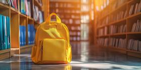 Back to School Preparation. Yellow backpack with books in front of a library bookshelf. Perfect for education, learning, and childhood themes.