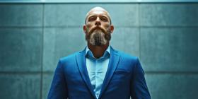 Sophisticated Gentleman in Blue Suit with Framed Portrait in Elegant Setting