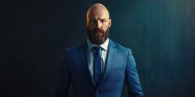Sophisticated Gentleman in Blue Suit with Framed Portrait in Elegant Setting