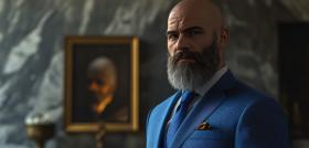 Sophisticated Gentleman in Blue Suit with Framed Portrait in Elegant Setting