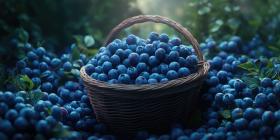 Fresh Blueberry Harvest. Wicker basket overflowing with ripe, juicy blueberries. Perfect for food, health, and summer themes.