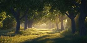 Enchanted Forest at Dawn. Sunbeams pierce through the trees, illuminating a magical scene with glowing particles. Perfect for fantasy, nature, and fairytale themes.