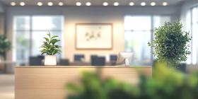 Modern Office Reception Area. Sunlit workspace with a clean design and stylish furniture. Perfect for business, interior design, and corporate themes.