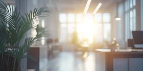Modern Office Reception Area. Sunlit workspace with a clean design and stylish furniture. Perfect for business, interior design, and corporate themes.