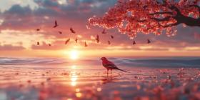 Sunset at the Seashore. A solitary seagull stands on the beach as the sun sets over the horizon, casting a warm glow on the water. Perfect for nature, beach, and travel themes.