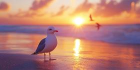 Sunset at the Seashore. A solitary seagull stands on the beach as the sun sets over the horizon, casting a warm glow on the water. Perfect for nature, beach, and travel themes.