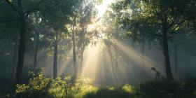 Enchanted Forest at Dawn. Sunbeams pierce through the trees, illuminating a magical scene with glowing particles. Perfect for fantasy, nature, and fairytale themes.