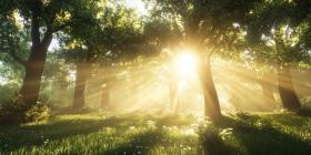 Enchanted Forest at Dawn. Sunbeams pierce through the trees, illuminating a magical scene with glowing particles. Perfect for fantasy, nature, and fairytale themes.