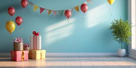 Festive Birthday Party Scene. A colorful cake with lit candles sits on a table surrounded by balloons and confetti. Perfect for birthday, celebration, and party themes.