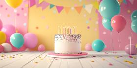 Festive Birthday Party Scene. A colorful cake with lit candles sits on a table surrounded by balloons and confetti. Perfect for birthday, celebration, and party themes.