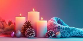 Cozy Winter Scene. Burning candles, pine cones, and a blue scarf create a warm and inviting atmosphere. Perfect for holiday, winter, and home decor themes.