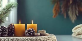 Cozy Winter Scene. Burning candles, pine cones, and a blue scarf create a warm and inviting atmosphere. Perfect for holiday, winter, and home decor themes.