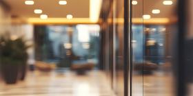 Autumnal Cityscape Through Glass. A view of a park with colorful trees through a large window. Perfect for interior design, travel, and seasonal themes.