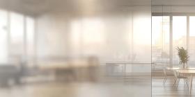 Autumnal Cityscape Through Glass. A view of a park with colorful trees through a large window. Perfect for interior design, travel, and seasonal themes.
