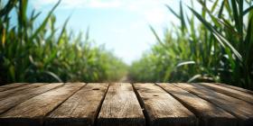 Rustic Wooden Table in a Verdant Field. A weathered tabletop with tall grass and a blue sky in the background. Perfect for nature, food, and product display themes.