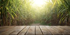 Rustic Wooden Table in a Verdant Field. A weathered tabletop with tall grass and a blue sky in the background. Perfect for nature, food, and product display themes.
