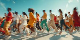 Dynamic Outdoor Gathering: People Walking and Running in Colorful Outfits Under a Sunny Sky