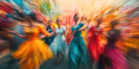 Dynamic Outdoor Gathering: People Walking and Running in Colorful Outfits Under a Sunny Sky
