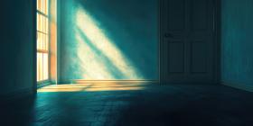 Sunlight Streaming Through Window in Empty Room. Dramatic light and shadow play in a minimalist interior with a closed door. Perfect for interior design, atmospheric, and moody themes.