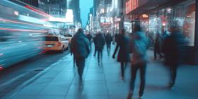 Dynamic Outdoor Gathering: People Walking and Running in Colorful Outfits Under a Sunny Sky