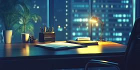 Luxury Penthouse Office at Night. Modern workspace with panoramic city views, sleek furniture, and ambient lighting. Perfect for business, luxury, and success themes.