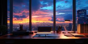 Luxury Penthouse Office at Night. Modern workspace with panoramic city views, sleek furniture, and ambient lighting. Perfect for business, luxury, and success themes.