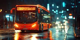 City Bus at Night. A red bus moves through a busy city street with blurred lights and reflections. Perfect for transportation, urban, and travel themes.