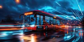 City Bus at Night. A red bus moves through a busy city street with blurred lights and reflections. Perfect for transportation, urban, and travel themes.