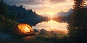 Camping by a Mountain Lake at Sunset. A tent glows with warm light near a serene lake with stunning mountain views. Perfect for camping, nature, and travel themes.