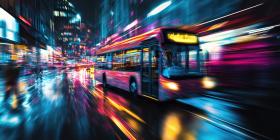 City Bus at Night. A red bus moves through a busy city street with blurred lights and reflections. Perfect for transportation, urban, and travel themes.