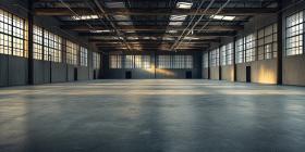 Industrial Warehouse Interior. A large, empty warehouse space with high ceilings and natural light. Perfect for industrial, architecture, and commercial themes.
