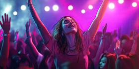 Concert Enthusiasm: Large Crowd of People with Raised Hands and Bright Lights at a Live Music Event