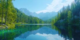 Serene Mountain Lake with Lush Forest. A tranquil scene with a crystal-clear lake surrounded by dense green trees and majestic mountains. Perfect for nature, travel, and serenity themes.
