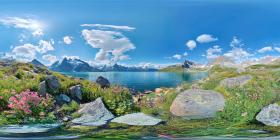 Scenic Mountain Lake with Clear Water. A breathtaking landscape with snow-capped mountains reflected in a crystal-clear lake. Perfect for nature, travel, and serenity themes.