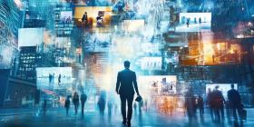 Person Observing a Large Array of Floating Digital Screens in an Urban Night Setting