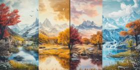Four Seasons in a Mountain Landscape. A majestic mountain range showcasing changing seasons from spring to winter. Perfect for nature, travel, and seasonal themes.