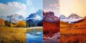 Four Seasons in a Mountain Landscape. A majestic mountain range showcasing changing seasons from spring to winter. Perfect for nature, travel, and seasonal themes.