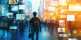 Person Observing a Large Array of Floating Digital Screens in an Urban Night Setting