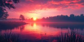 Dramatic Sunset over a Serene Lake. A fiery sky reflects on calm water with trees and reeds silhouetted in the foreground. Perfect for nature, landscape, and atmospheric themes.