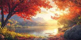 Dramatic Sunset over a Serene Lake. A fiery sky reflects on calm water with trees and reeds silhouetted in the foreground. Perfect for nature, landscape, and atmospheric themes.