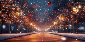 Snowfall on a Christmas Street. A winter wonderland scene with snow-covered trees adorned with festive lights. Perfect for holiday, winter, and festive themes.